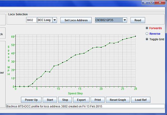 Lorsque le Bachrus MTS-DCC est défini comme une connexion mise parallèlement à un système DCC, l'outil Speedo permet la mesure automatique du profil de vitesse d'une locomotive équipée d'un décodeur