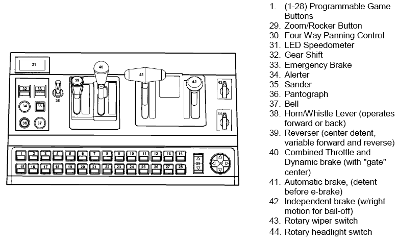 Le levier suivant, intitulée "Régulateur frein Dyn" (40 sur la figure), contrôle le réglage de la vitesse du décodeur Pour l'instant, la vitesse zéro est (grossièrement) le centre, et les vitesses supérieures sont lorsque le levier est tiré vers l'arrière.