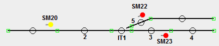 Dans l'exemple ci-dessus, une Logique Mât de Signalisation depuis SM20 à SM24 serait invalide si SM23 est entre les deux. Vous avez à créer deux Logique Mât de Signalisation distinctes, l'une comme ci-dessus pour SM20 à SM23, la seconde pour SM23 à SM24.