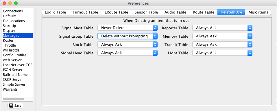 Ceci vous permet de modifier la manière dont les messages d'information et d'avertissement sont affichés dans JMRI.Il vous permettra également de configurer les réponses par défaut et la la question qui s'affiche.