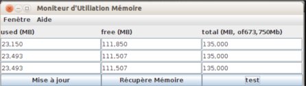 La partie supérieure affiche des informations sur la mémoire. Chaque fois que vous appuyez sur le bouton "Mise à jour", la ligne de fond obtient de nouvelles valeurs et les valeurs anciennes sont déplacés vers le haut. Ceci est la page d'aide help/fr/package/jmri/jmrit/