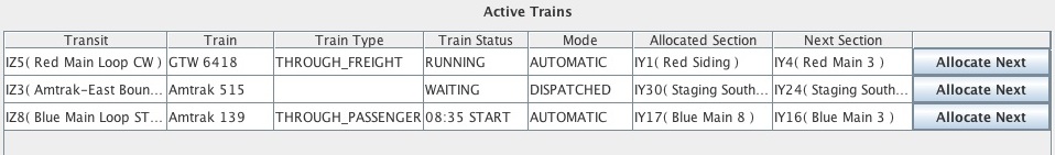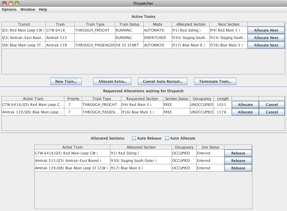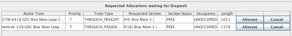 Tous les Trains Actifs sont affichés dans un Tableau dans la Fenêtre du Dispatcher , ainsi que des informations sur l'état du Train Actif. La fenêtre du Dispatcher contient également un Tableau d'attente des Demandes d'Allocation , un Tableau des Sections Allouées, et des boutons qui permettent au répartiteur de facilement allouer des Sections, créer de nouveaux Trains Actif, et de résilier des Trains actif. Les Sections Allouées sont libérées à l'aide des boutons dans Le Tableau Sections Allouées, ou automatiquement Si l'Option libération automatique est sélectionnée. La Fenêtre Dispatcheur est expliquée en détail ci-dessous.