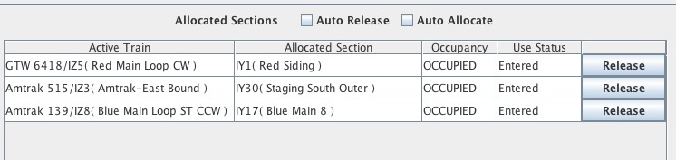 Le Tableau Sections Allouées affiche toutes les Sections actuellement affectées aux Trains Actifs. Ce Tableau sert à deux fins. Il montre quelles Sections Allouées sont attribuées et à quels Trains Actifs, et il permet au répartiteur de libérer une Section allouée pour une utilisation par un Train Actif différent.