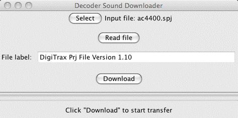 L'outil décodeur Téléchargeur Son vous permet de charger un nouveau fichier .spj en un décodeur de son Digitrax via une interface PR2 ou PR3 Digitrax. Si vous utilisez un PR3, il doit être mis en mode "Programmateur", avant d'essayer de télécharger, consultez la page principale PR3.