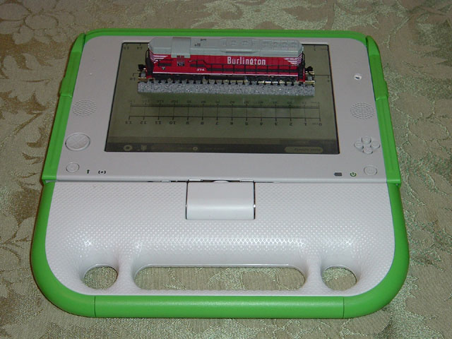 XO running ruler activity, posed with an N scale locomotive to show how small it is. This is truly a N scale computer for N scale trains.