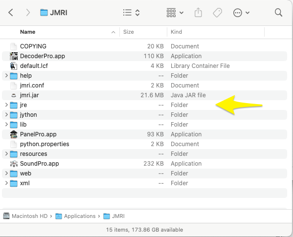 Open the JMRI folder in the Applications folder (this is where you would normally launch JMRI)When you're done, the JMRI folder contents should look like the picture to the right.