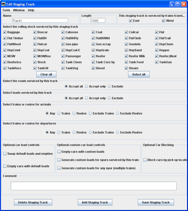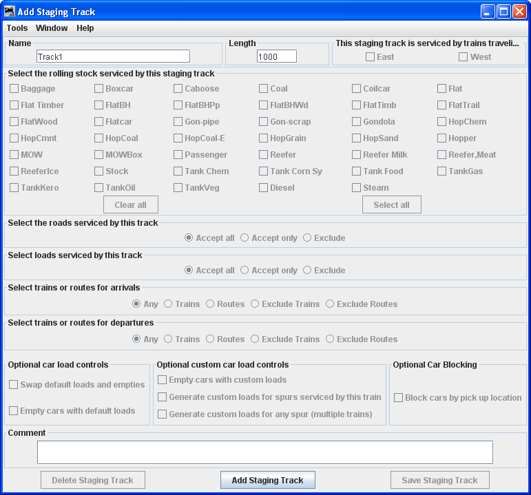 Optional car load controls Swap default loads and empties Empty cars with default loads Optional custom car load controls Empty cars with custom loads Generated custom loads for spurs serviced by this train Generate custom loads for any spur (muliple trains) Optional Car Blocking Block cars by pickup location You may enter a Comment for the track. You may now press to add to the location or press if you do not want to store the track. If you want to add another track to this staging location, then enter new data and Press to add the track. Note if you are running a train to and from the same staging location, you must define two staging tracks for the program, one to depart and one to return on. Physically, the tracks can be the same track. Close the window when done with this location. |