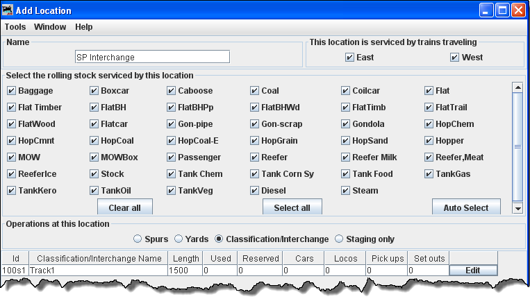 Next Select the rolling stock serviced by this location, you can control the rolling stock a location can service. Push the to deselect all types, or to select all types, then select or deselect the rolling stock you wish the location to accept.