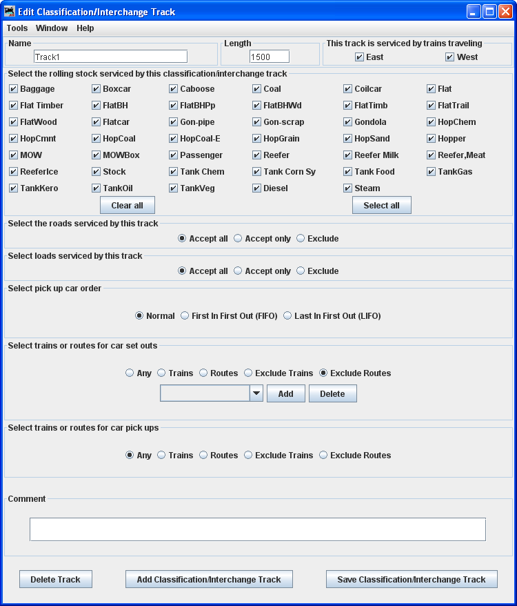 We will use the default go to links to setup Trains or Routes. The Trains and Routes must be created prior to selecting. You may enter a Comment for the track. You may now press to add to the location or press if you do not want to store the track. If you want to add another track to this interchange location, then enter new data and Press to add the track. Close the window when done with this location. |