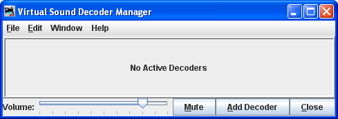 Launch the VSDecoder Manager by selecting "Virtual Sound Decoder -> VSDecoder Manager" from the Debug menu. A simple window will appear, with a blank panel, a volume/mute control, and an "Add Decoder" button.
